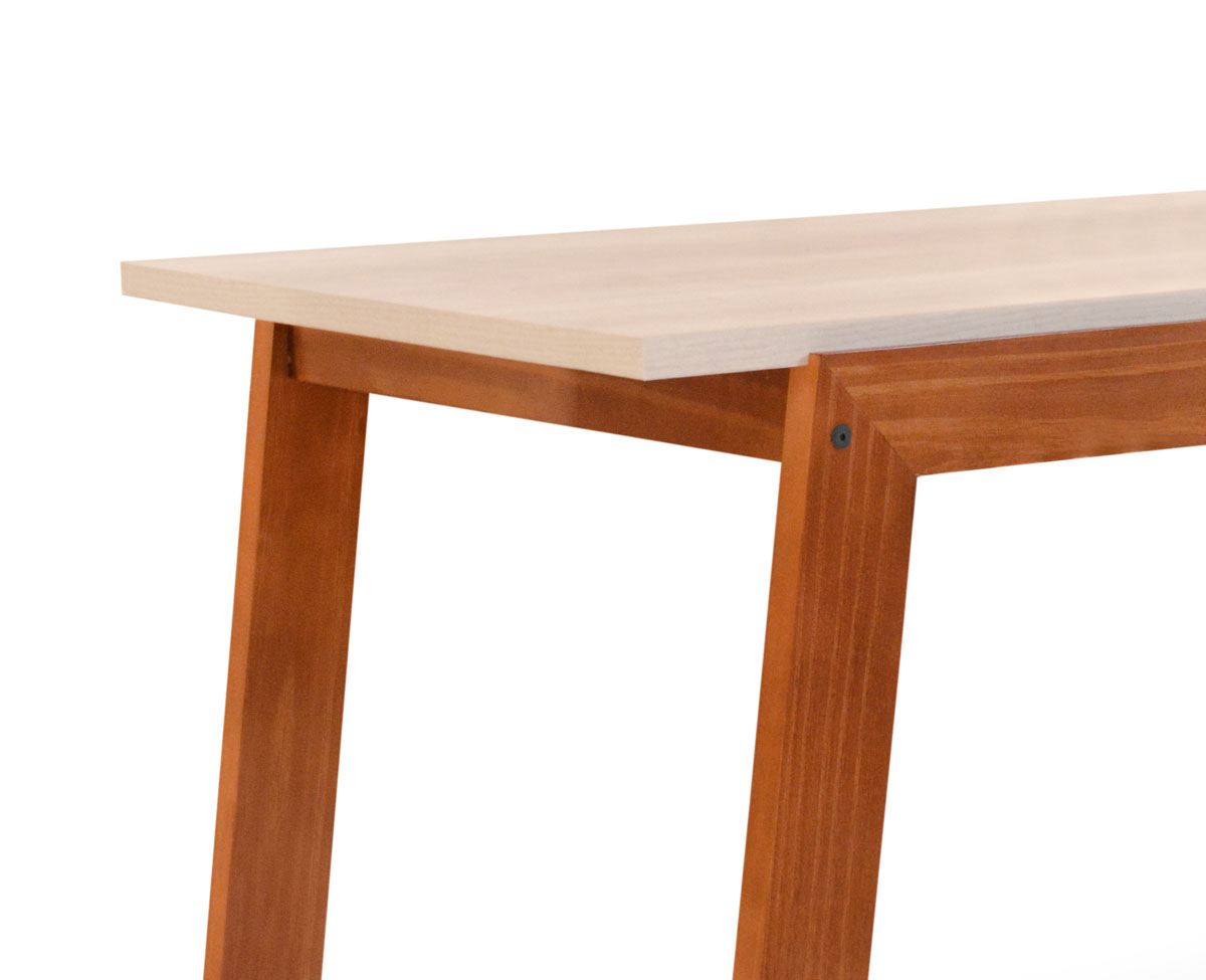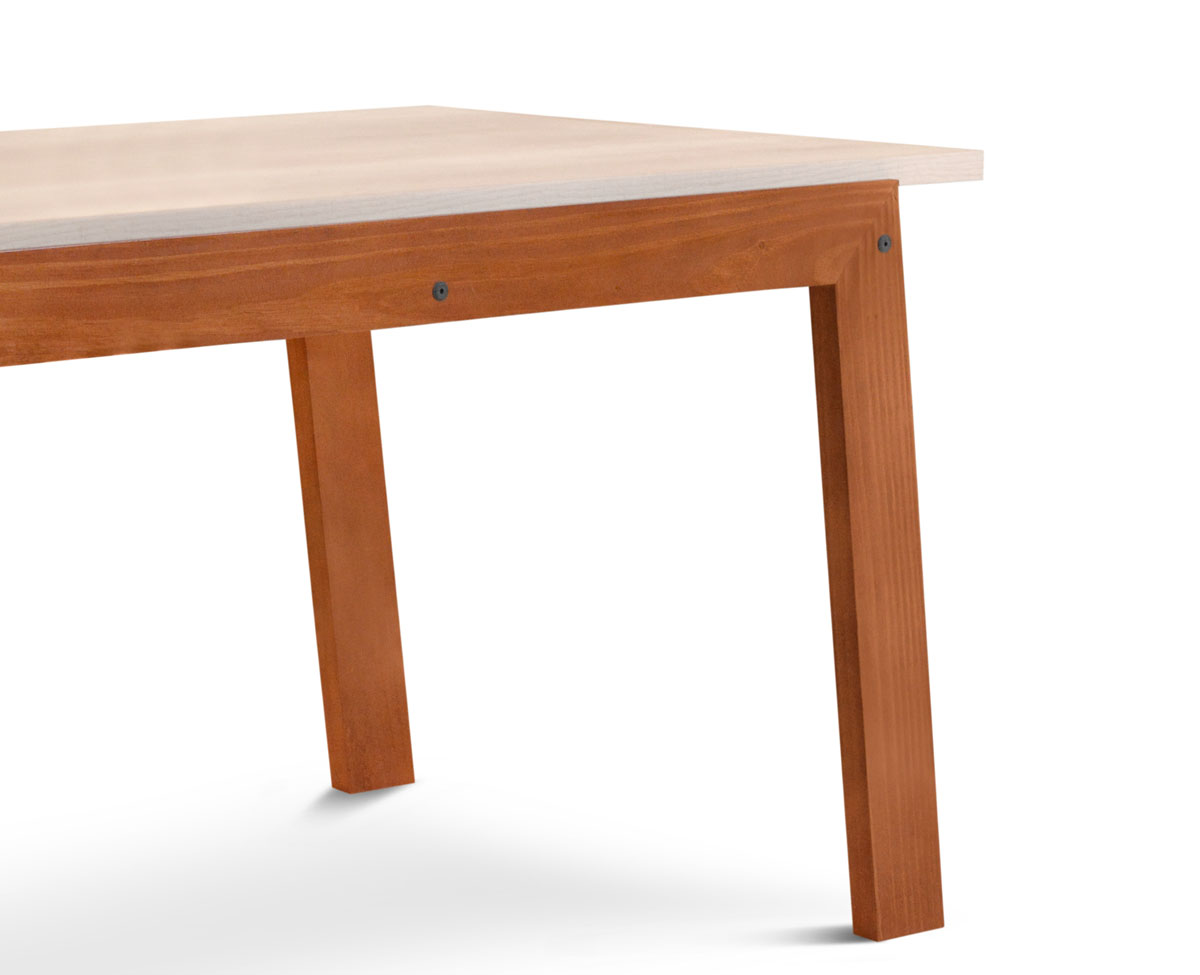 Mesa para comedor fabricada en madera maciza de Pino Clear y Melamina. Moderno diseño que combina madera maciza y tapa de melamina.