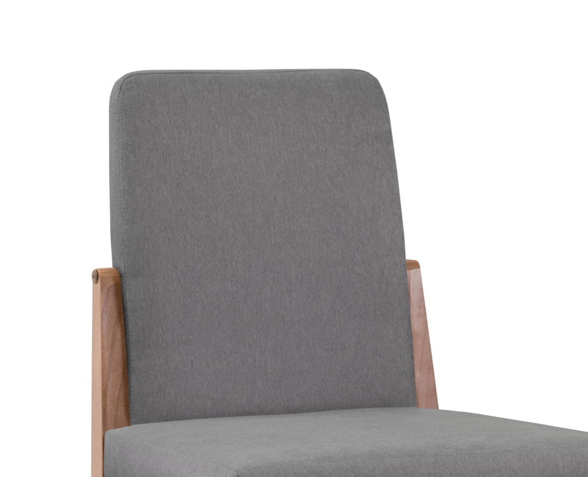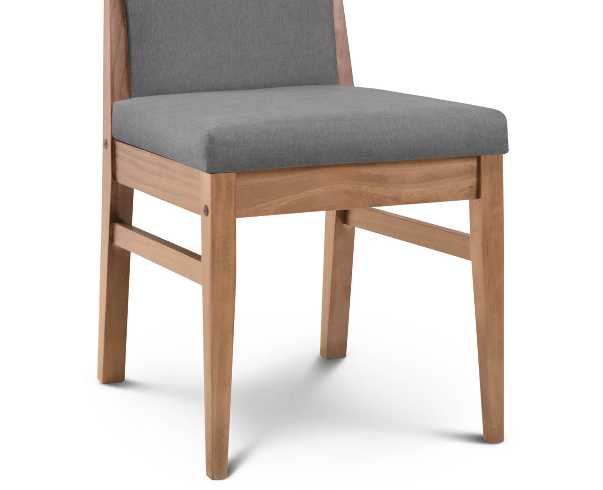 Silla fabricada en madera maciza de Pino Clear. Tapizada con tela Sunny.